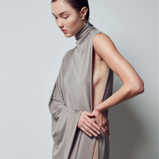 Her path includes formal training in dance, but after reaching a point where health issues limited her ballet practice, she turned to fashion. She studied fashion design at Modatex. Her work is distinguished by the use of forms that explore the contrast between rigidity and fluidity, strong silhouettes that challenge gender categories, contrasts of light and shadow, accentuated volumes, predominantly dark tones with flashes of brightness, and cuts that express duality: between masculine and feminine, between what is present and what is memory.